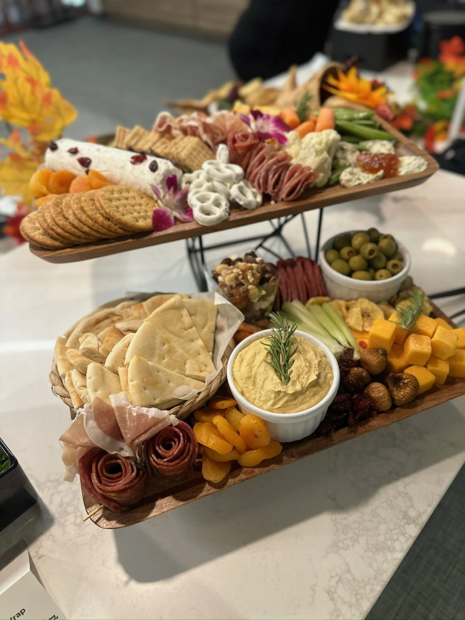 Take your event to the next level with our grazing boards, offering a diverse assortment beyond just meats and cheeses. Designed for medium to large gatherings, these boards provide an abundant spread of cheeses, meats, dips, fruits, vegetables, breads, sweets, and international flavors such as Mediterranean mezze, Tex-Mex, or brunch-themed selections.